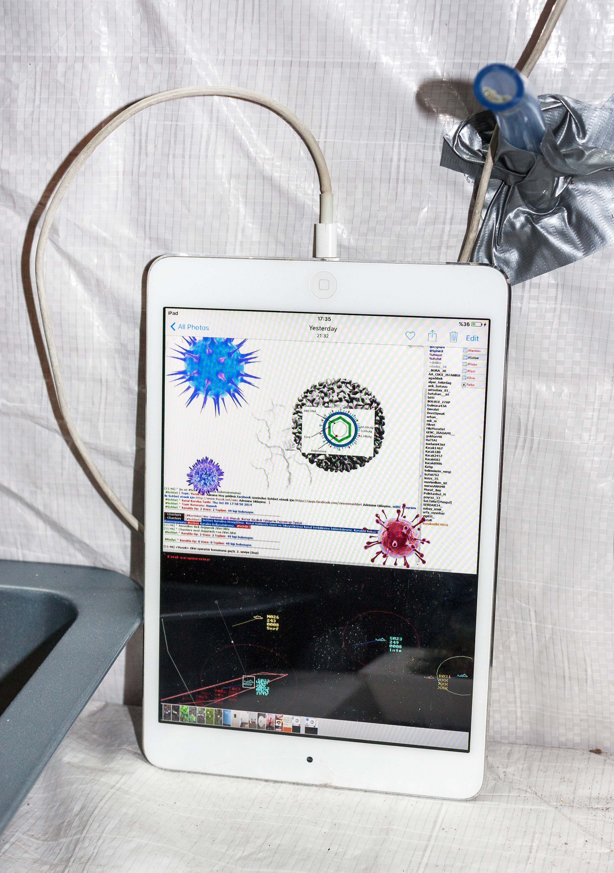 On the wall-sized tarpaulin are three dwarf-sized openings. Everything seems to be provisionally, it is stuck with black tape. I bend down, turn, twist my neck, stretch my torso to catch snippets. A head pierced with nails and wearing a mask is staring at me with its bluescreen-blue-reflective glasses. Placed in front of a metal shield, a light haze settles on the shimmering fabric of the mask, a drop of water falls down off the nail. My eyes descend to the forming puddle. I see a basin filled with a dark, heavy liquid, partially spotted with black seeds that are surrounded by a translucent, whitish layer. Pipes and tubes leave and commit the basin, I hear a slight rustle and rattling. Next to the pool is a digital image. I see different signs and think of quantum physics; systems and metaphors of a world that are not mine. Maybe everything will collapse in the next few seconds and maybe it will build up right away, or disappear through an invisible implosion. Cables wind like brain fibers over the surfaces, I see more differently shaped basins like broken skullcaps, filled with liquids. A blue lamp tries to illuminate a container, which carries a chunk in itself. The chunk does not understand the blue light and remains unimpressed crystalline as before.