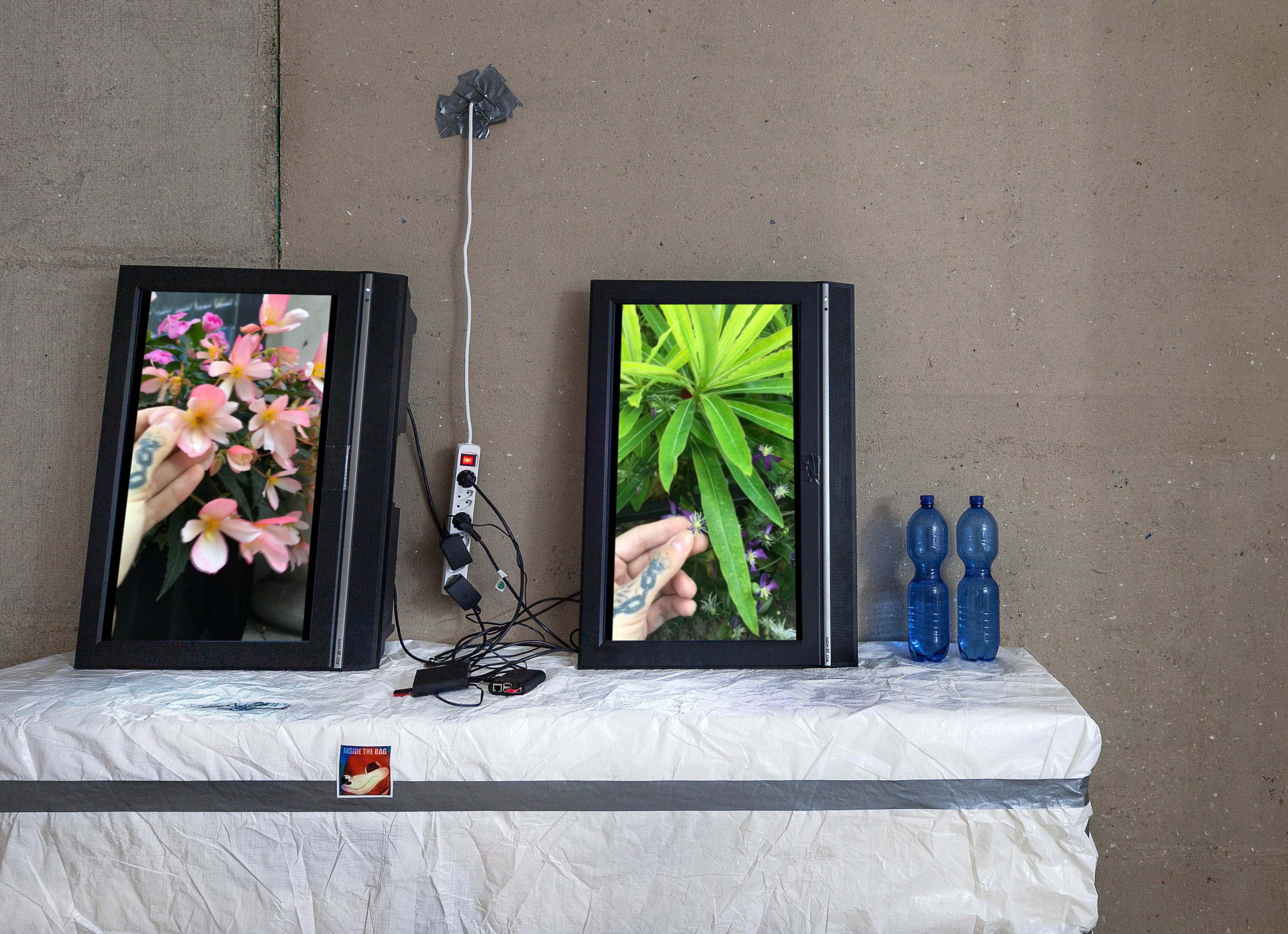 I look to the left: hands are touching flowers, stroking them, caressing them; the flowers do not fight back (how should they even?). I feel uncomfortable: the hands show me the flowers, the hands show themselves, I see delicate, fleshy fibers full of black-blue drawings. The hands and flowers disappear before my eyes, I see Rorschach pictures on them, what do I see? A fetish-like ritual, a conjuration of stories, dissolved entities, that I do not know. Who writes this story? Another look, hands and flowers change arrhythmical, they never stop touching and banishing me from their world. I go on, to the windows inside the white tarpaulin.